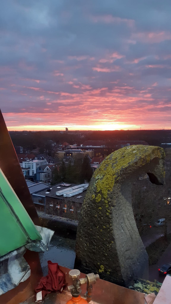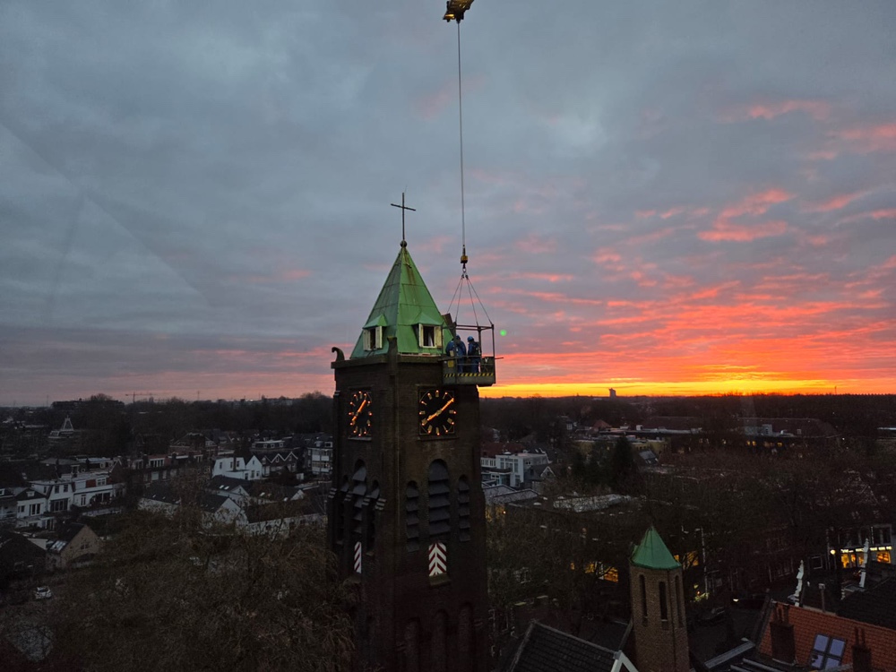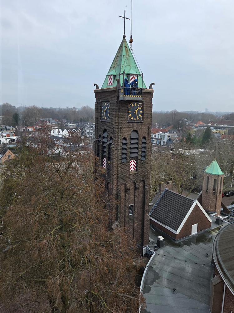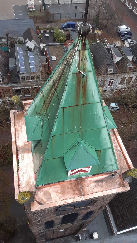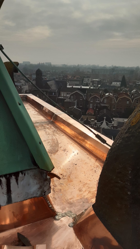 Van september 2025 tot en met februari 2026 is er gewerkt aan groot onderhoud van de Wilhelminakerk. Bijgaande foto’s betreffen de ‘kroon’ op het werk: de prachtig glimmende (koperen) omlijsting van de hoogste toren, maar er is veel meer gedaan dat van belang is voor het behoud van het kerkgebouw: zo is een groot deel van het dak van de kerk vernieuwd, en dat was nodig ook, want de plastic bakken om de lekkage op te vangen stonden al veel langer op de galerij. Veel voegwerk aan de diverse torens en grote koepel is vernieuwd, alsmede ook rotte kozijnen in de koepel.