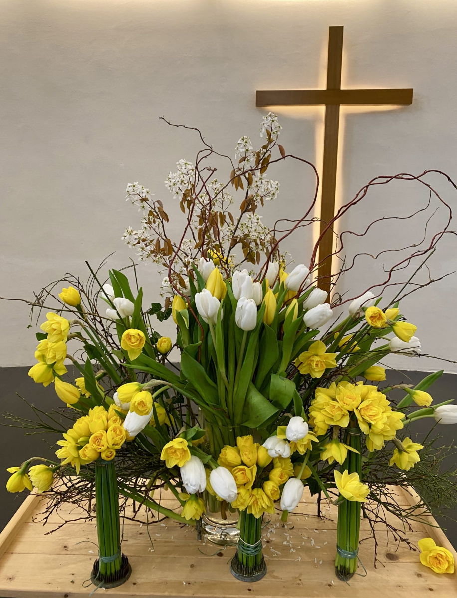 Een feestelijke schikking moet het worden! Met gele en witte narcissen en tulpen, symbolen van de lente, die als het ware het nieuwe leven belichamen.