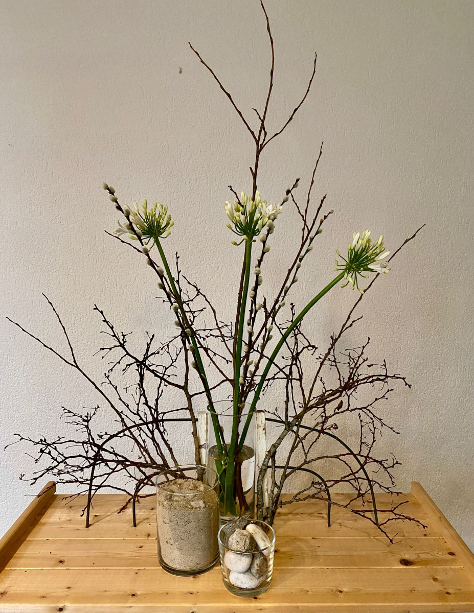 Deze schikking richt zich niet op de profeten op de berg maar op de metgezellen van Jezus. De grote vaas is gevuld met water, 3 witte bloemen en wilgentakken. Zand en stenen in de kleine vazen benadrukken de berg.